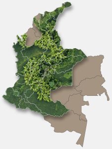 La soi-disant zone caféière colombienne, ou Eje Cafetero (Paysage Culturel du Café), située au centre du pays comprend les régions caféières de Caldas, Quindío, Risaralda ainsi que le nord du Valle del Cauca. Cependant, la production nationale de café ne provient pas exclusivement de cette région; des régions comme Antioquia, Cundinamarca, Boyacá et le nord du Tolima présentent des conditions similaires à celles du Paysage Culturel du Café et permettent également des récoltes presque toute l’année. Dans les zones plus chaudes, situées au nord et à plus basse altitude — comme la Sierra Nevada de Santa Marta, la Serranía del Perijá, Casanare, Santander et Norte de Santander — les cafés ont généralement une acidité plus douce et un corps plus marqué. À l’inverse, les cafés provenant des régions plus méridionales comme Nariño, Cauca, Huila et le sud du Tolima, cultivés à des altitudes plus élevées et plus proches de l’équateur, développent une acidité plus vive et une douceur particulièrement recherchée.
